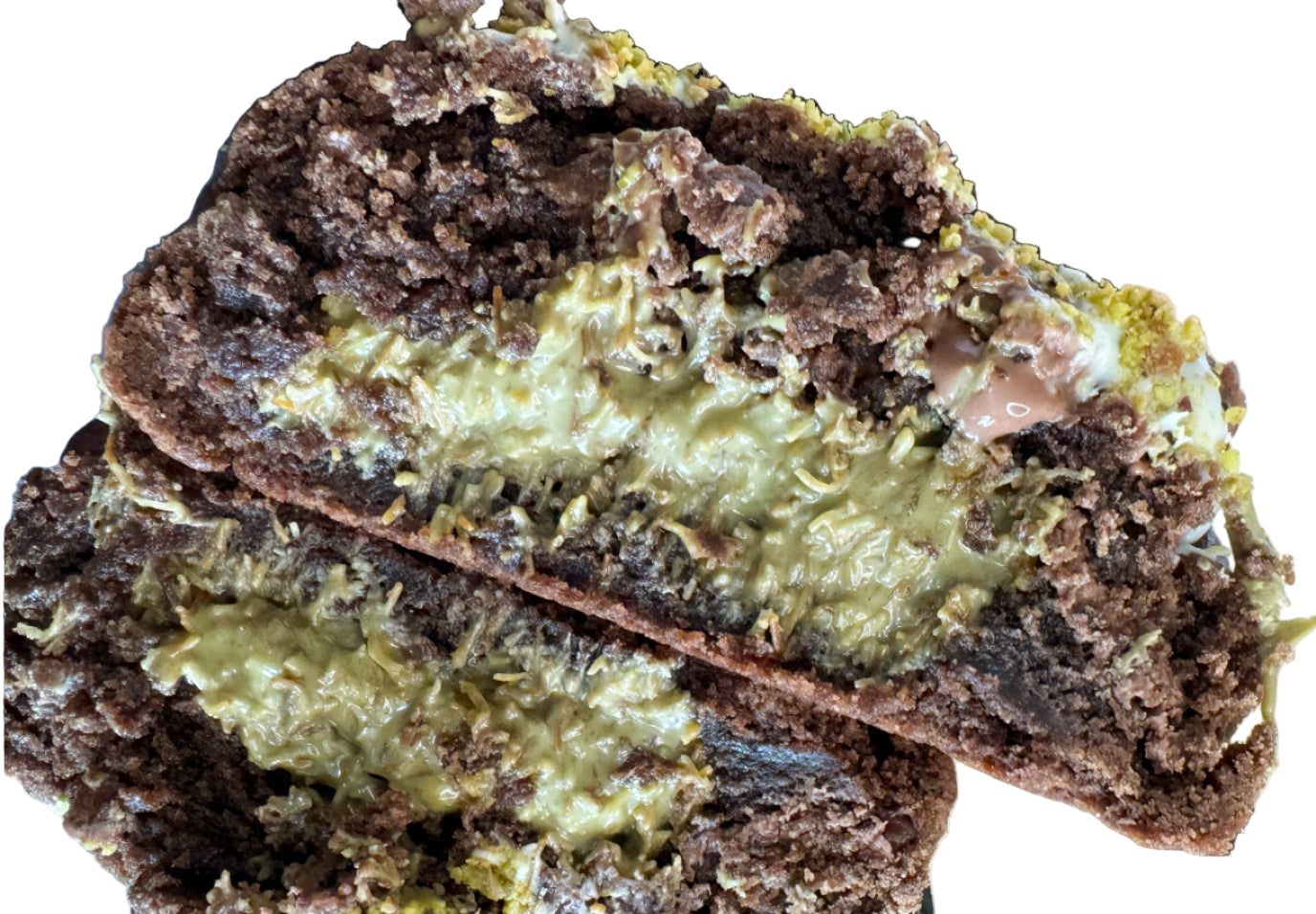 A luxurious chocolate cookie stuffed with delicate kunafa and pistachio butter, imported from Italy, topped with the pistachio butter, drizzle and pistachio crumbs.