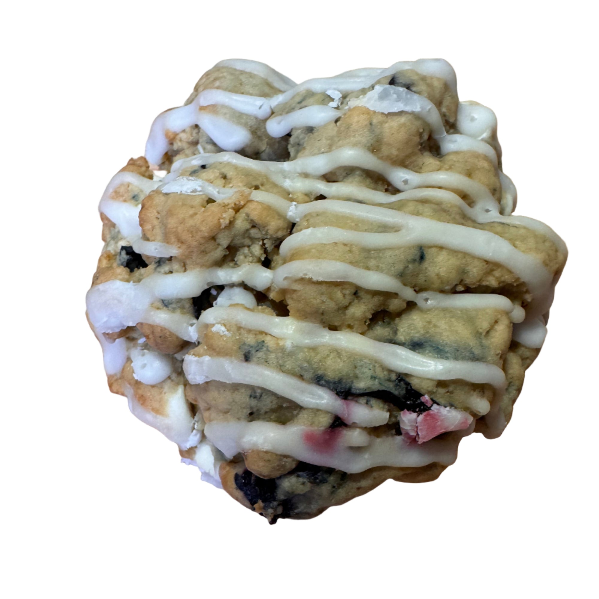 A cookie named after our daughter, our little blueberry! A delightful blend of blueberries, lemon, and white creme chips, topped with a tangy lemon glaze.