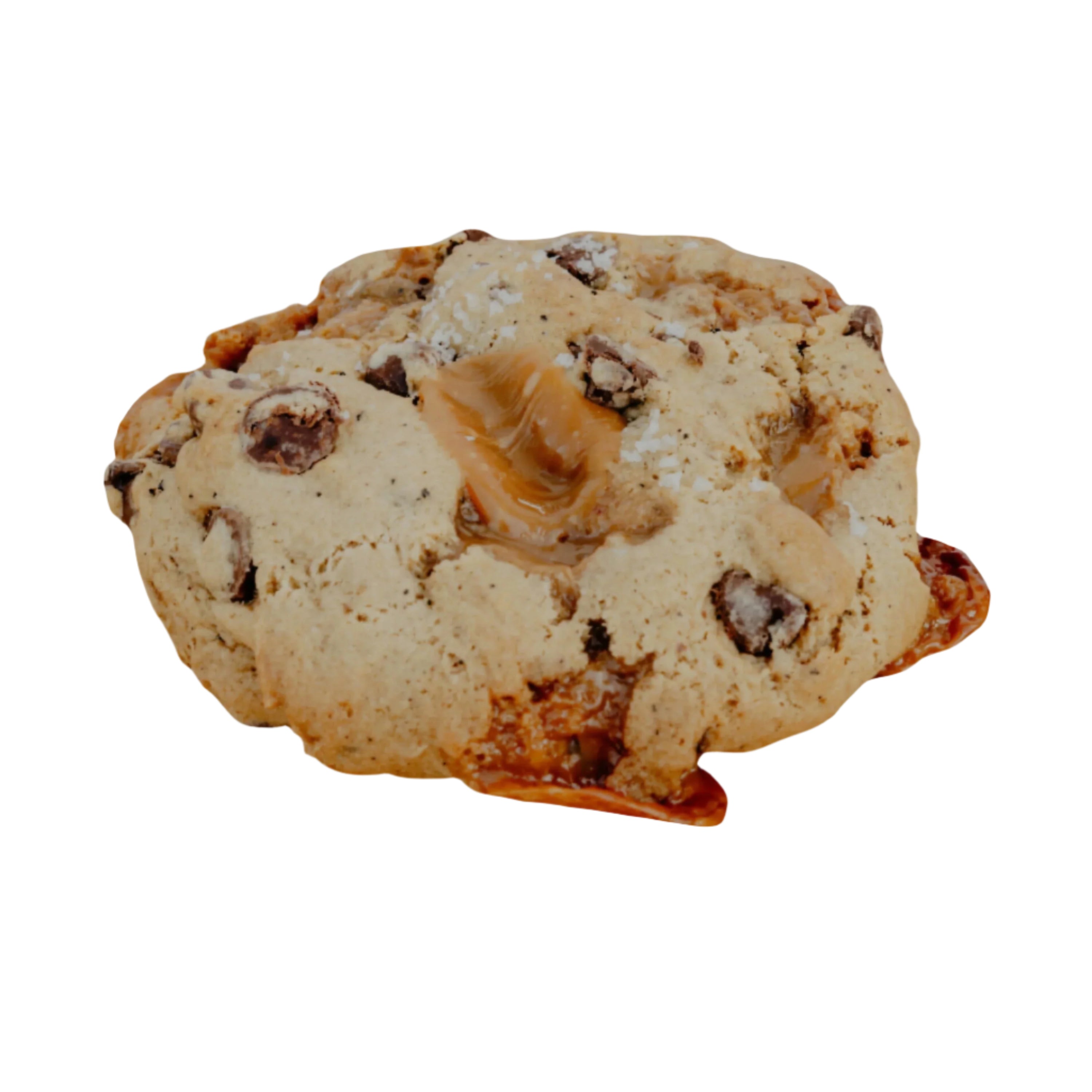 A rich chocolate chip cookie with soft caramel, topped with flaky salt and made with brown sugar for a deep, cozy flavor.